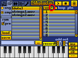 Now, press the "+" button above the instrument list. This will unfold the instrument and you'll see a second list below the instrument list, which is the list of samples. The number on each key denotes the sample that is mapped to it. Later we'll see how to edit this mapping.