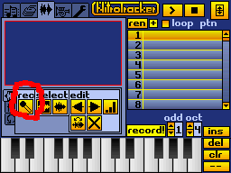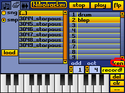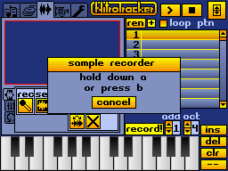 To review what you recorded, select octave 4 in the "oct" number box on the lower right of the screen, and then press and hold the leftmost keyboard button. This will play back your sample at the note C-4, which is the original recording frequency. After cutting and normalizing your recorded sound, you'll have a brand new instrument!